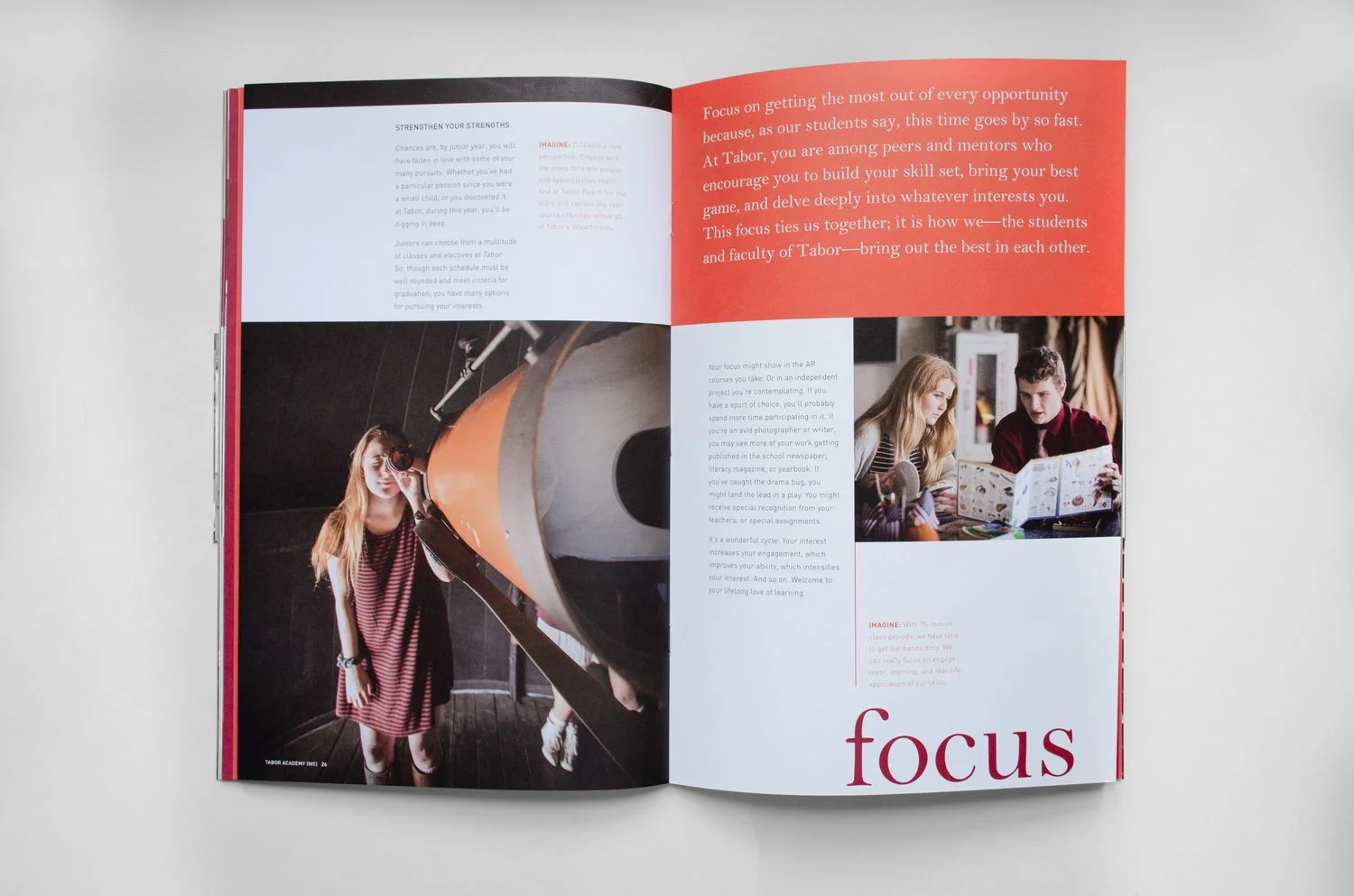 This view book was created for incoming and prospective students for Tabor Academy. The theme of this project is "What we means to me" as a means of sharing stories of finding one's place in a large group setting.